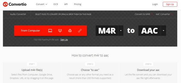 除了 Zamzar 在线音频转换器, Convertio 是另一款出色的 M4R 转 AAC 免费转换器。它支持几乎所有常见的音频格式,并能快速高效地将所有音频格式进行转换。本指南将指导您如何直接轻松地将 M4R 文件转换为 AAC。