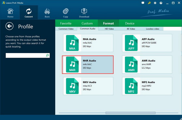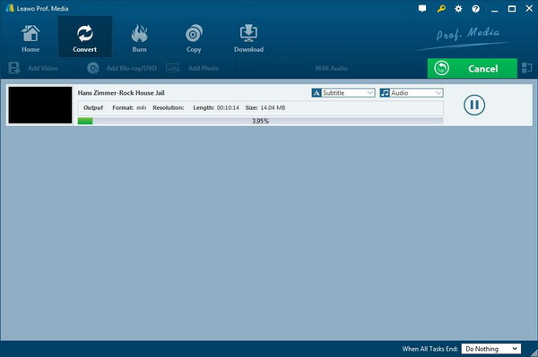 作为最受欢迎的 OGG 到 M4R 转换器之一, Leawo 视频转换 允许用户转换超过 180 格式之间相互转换,例如 OGG 到 M4R, WMV到MP4,M4R 到 AAC, MOV 到 AVI, MKV 到 MOV等等。此外,它还支持 iPhone、iPad 和所有便携式设备的视频和音频转换。它支持批量文件转换,并拥有许多令人惊叹的功能,包括合并所有文件为一个、修剪视频或音频文件的长度、裁剪视频片段、添加水印等等,功能强大,功能多样。