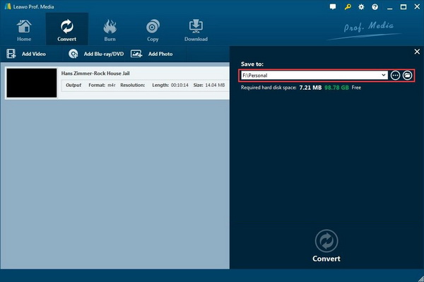 完成必要的设置后,单击绿色的大“CONVERt”按钮弹出侧边栏,您可以在其中设置保存输出 M4R 文件的输出路径。