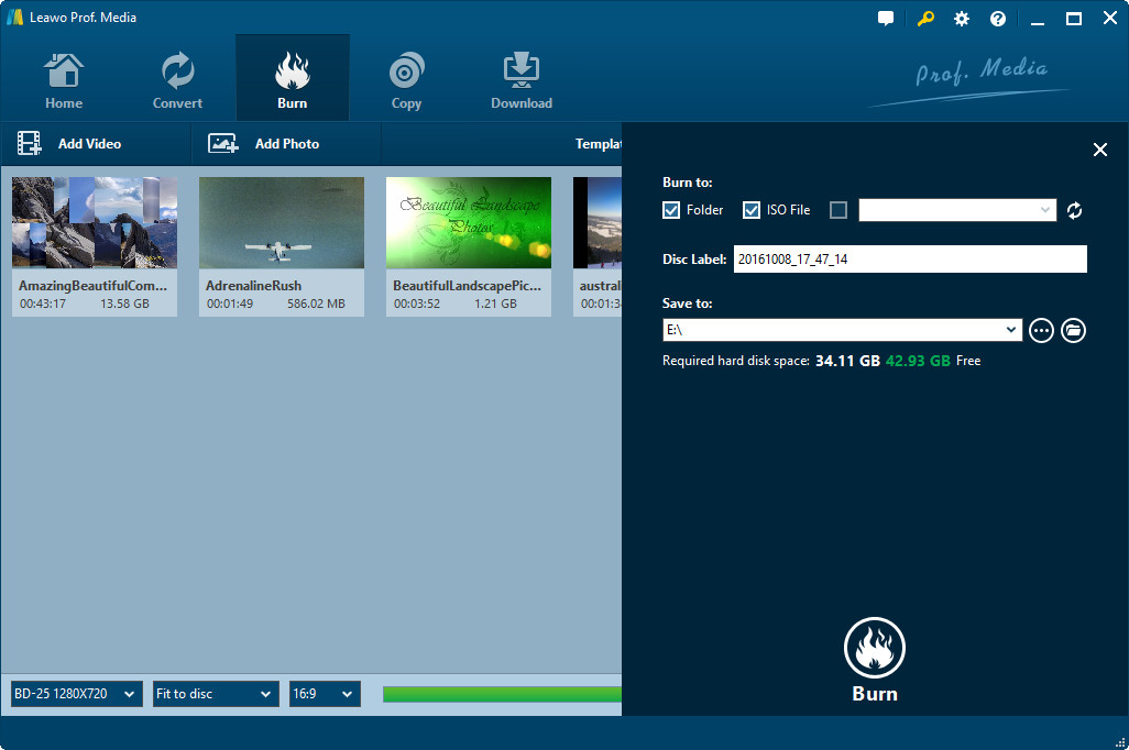 步骤 3。 点击绿色的“刻录”按钮,调出设置侧边栏,您需要在其中设置“刻录到”(可多选)、“光盘标签”和“保存到”选项。要将 MP4 刻录到 DVD 光盘,请在“刻录到”下选择光盘驱动器作为目标。“刻录到”选项可多选。