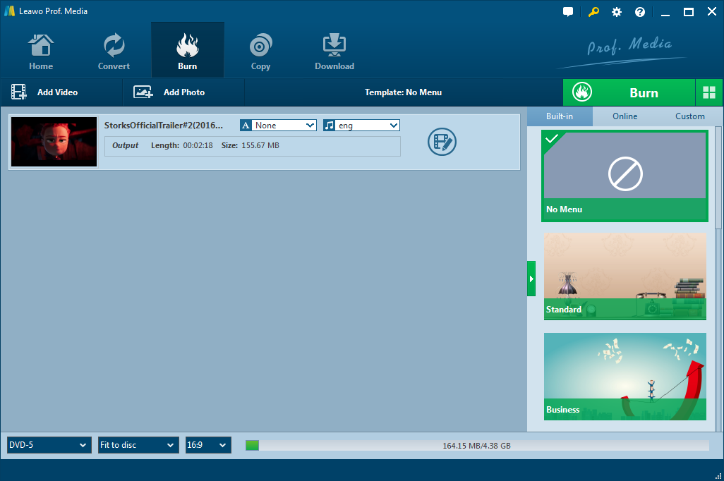 为了将 MP4 刻录到 DVD 以便在各种 DVD 播放器上播放,我们最好找到一款功能强大的软件,它可以自动将 MP4 刻录到 DVD 光盘。以下是解决方案 - Leawo DVD刻录。下面将介绍 Leawo DVD 创建器以及有关如何使用这个出色的工具成功将 MP4 刻录到 DVD 以便在 DVD 播放器上播放的详细指南。