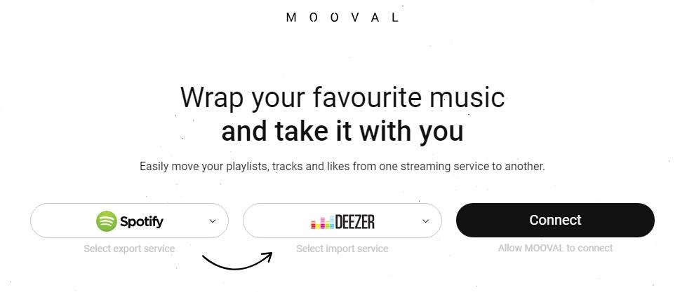 除了将 Spotify 转移到 Deezer 之外,有时您可能还需要将 Deezer 转移到 Spotify,因为 Deezer 提供的歌曲比 Spotify 更多。那么,如何才能轻松地做到这一点呢?当然,有一些简单的在线解决方案,其中 Mooval 是最简单的方法,可以将您的播放列表、曲目和点赞从一个流媒体服务转移到另一个流媒体服务,包括 Spotify、Deezer 和 Napster。您可以按照以下步骤轻松地将 Spotify 播放列表转移到 Deezer:
