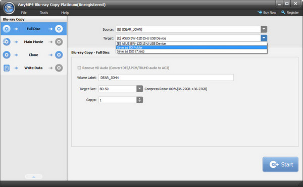 步骤4: 完成其他更改(例如输出蓝光卷标、目标大小和副本数量)后,只需单击主窗口右下角的“开始”按钮即可。蓝光逐位复制过程将立即开始,并很快完成。
