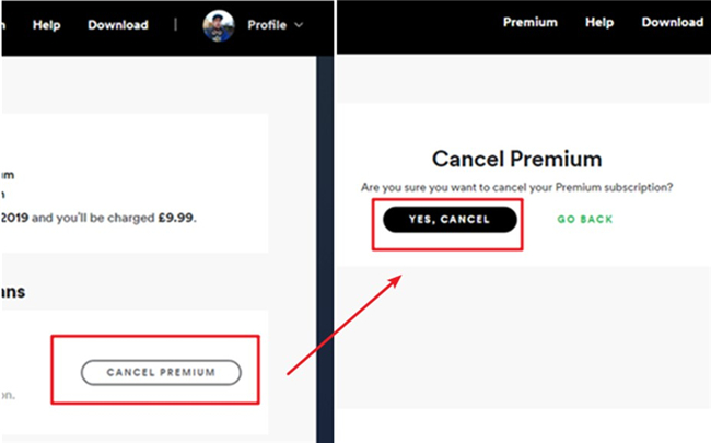 步骤3:在下一个界面中,您需要点击“取消高级版”按钮才能继续。Spotify 会询问您是否确定取消您的高级版订阅,在这里您需要点击“是,取消”才能完美完成整个任务。