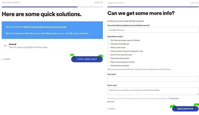 步骤3:填写完表格后,您可以点击“发送问题”按钮寻求帮助。支持团队收到您的问题表格后,将通过您的电子邮件地址与您联系,并协助您在同意的情况下取消 Spotify Premium。或者,您也可以在 Twitter 上联系 Spotify @Spotify关心 向您发送问题并寻求帮助。