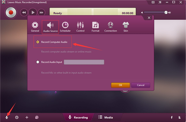 运行 Leawo 音乐录音机,然后单击其主录音界面中的“音频源”图标以调用设置面板。由于您希望在试用期间下载 Spotify Premium 音乐,因此您需要选择“录制计算机音频”选项,默认情况下,该选项用于在线音频和流式音频录制。如果您选择“录制音频输入”选项,您将能够从内置输入音频(如麦克风)录制音频。