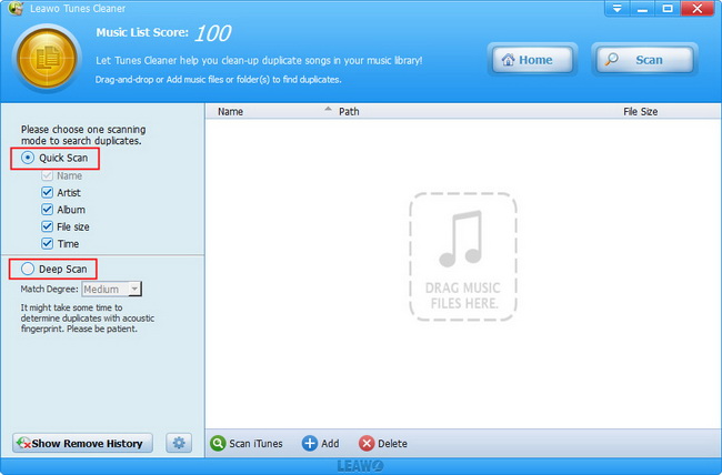 正式上线 Leawo Tunes Cleaner 进入主界面,然后点击“清理重复项”条目来扫描重复歌曲。重复歌曲扫描有两种模式:快速扫描模式和深度扫描模式。请选择您喜欢的模式。