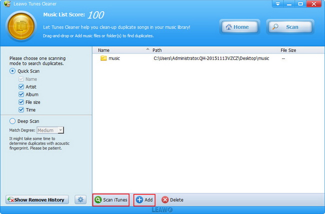 直接单击“扫描 iTunes”按钮或单击“添加”按钮加载音乐文件以扫描重复项。