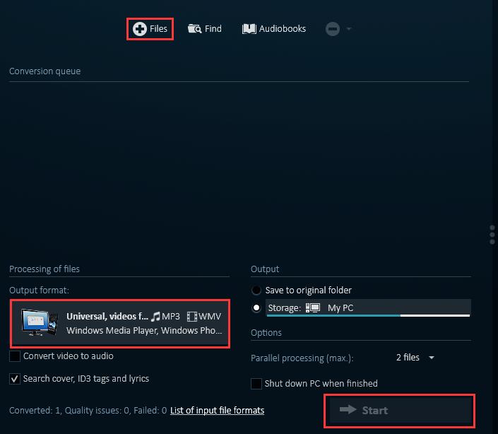 3. 点击“文件”选择“添加文件”或“添加文件夹”上传有声读物。然后点击“输出格式”下方的电脑图标,选择输出格式为 MP3您还可以选择比特率。之后,您可以选择“保存到原始文件夹”或“存储:我的电脑”。现在点击“开始”将有声读物转换为 MP3.