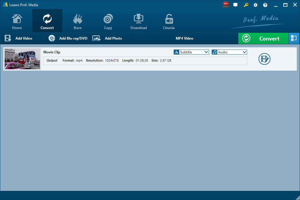 正式上线 Leawo 在视频转换器中,转到“转换”选项卡,然后点击子菜单上的“添加视频”按钮,加载源 DAT 视频文件。或者,您也可以直接将 DAT 视频文件拖放到程序界面中。导入 DAT 视频文件后,您可以播放 DAT 视频文件、从源 DAT 视频文件中选择字幕和音轨、为加载的 DAT 视频文件添加外部字幕、编辑加载的 DAT 视频文件等等。
