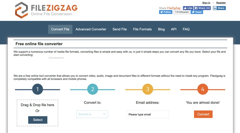下一个适用于 Mac 的 MOV 转 FLV 转换器是名为 FileZigZag 的在线文件转换工具。由于它是一款实用且免费的在线文件转换器,因此没有任何系统要求,您可以在 Windows、Mac 或 Linux 系统上自由转换任何 MOV 视频文件。此外,FileZigZag 不仅可以将 MOV 等视频转换为 FLV,还可以轻松地在线转换其他文件,例如文档、压缩文件和图像。网站上提供了一个清晰的四步指南,使文件转换操作简单易懂。以下是使用 FileZigZag 在 Mac 电脑上在线转换 MOV 到 FLV 的简单指南。