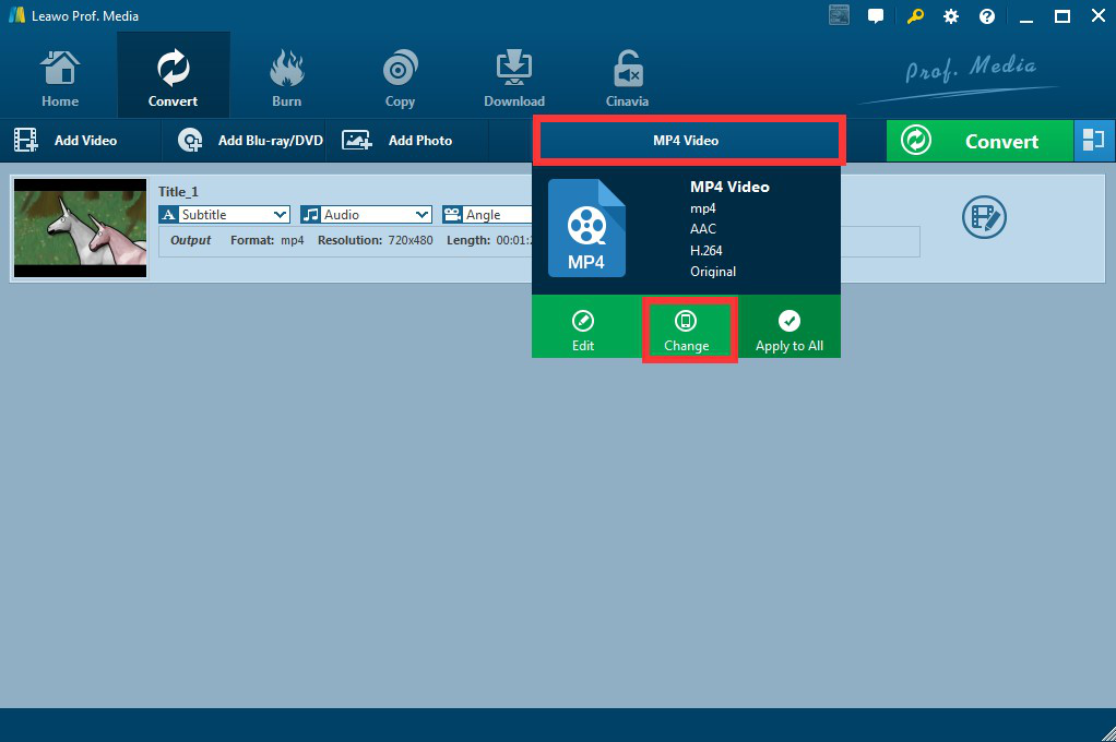 步骤3:从配置文件菜单中选择 H.264。在绿色的“转换”按钮之前,您会看到一个按钮(默认标记为“MP4 视频”),该按钮会根据所选的配置文件而变化。点击该按钮,然后从下拉菜单中选择“更改”。接下来,点击“格式”,然后在“常用视频”下找到并点击“H.264 MP4”。