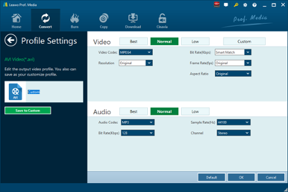 注意:如果需要,您可以单击下拉配置文件设置框上的“编辑”按钮来调整视频和音频参数,如视频编解码器、宽高比、帧速率、分辨率、音频编解码器、比特率、通道、采样率等。