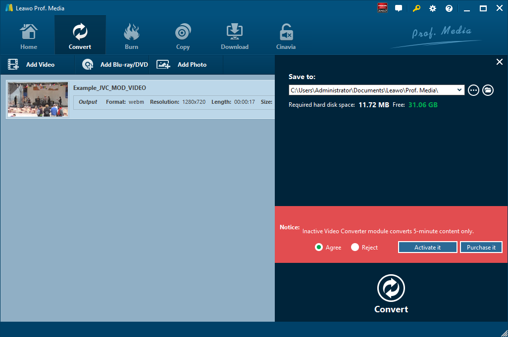 正式上线 Leawo 在视频转换器中,转到“转换”选项卡,然后点击子菜单上的“添加视频”按钮,加载源 NUT 文件。或者,您也可以直接将源 NUT 文件拖放到程序界面中。导入 NUT 文件后,您可以播放源视频文件、从源 NUT 视频文件中选择字幕和音轨、为加载的视频文件添加外部字幕、编辑加载的视频文件等。