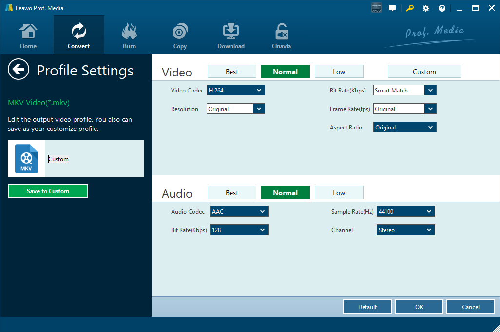 注意:如果需要,您可以单击下拉配置文件设置框上的“编辑”按钮来调整视频和音频参数,如视频编解码器、宽高比、帧速率、分辨率、音频编解码器、比特率、通道、采样率等。