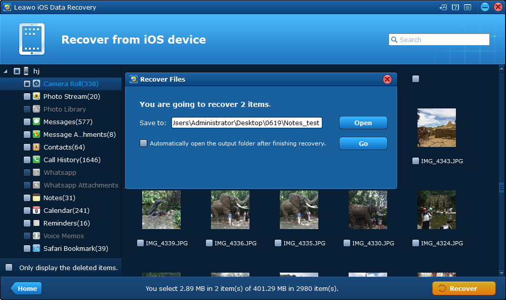 步骤4. 出现对话框后,用户可以通过单击“保存到”选项旁边的“打开”来选择将短信保存到PC的目标文件夹。点击“开始”开始恢复。最后,您可以使用 Leawo iOS数据恢复成功。