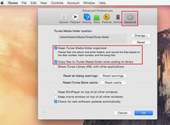 5. 再次启动 iTunes,进入“偏好设置”>“高级”,勾选“保持 iTunes 音乐文件夹井然有序”和“将文件添加到资料库时将文件复制到 iTunes 音乐文件夹”。完成后点击“确定”。