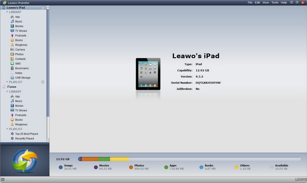 通过 USB 数据线将 iPad 插入电脑并启动 Leawo iTransfer。软件会自动识别你的iPhone。在右侧界面,你可以看到iPad的基本信息。在左侧边栏,你可以看到iPad资料库和iTunes资料库。在这些资料库下,你可以看到不同类别的内容。