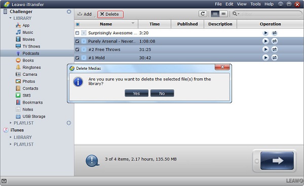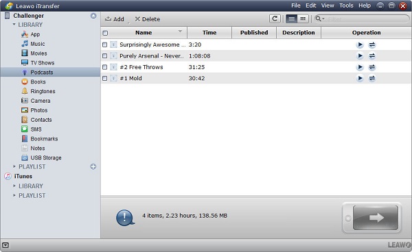 我可以在电脑上删除 iPad 上的播客吗?是的,我建议 Leawo iTransfer 为你。 Leawo iTransfer 宣称自己是一个多功能文件管理器,能够在计算机上轻松管理 iOS 文件。有了它,您可以在 iPad、iPhone、iPod、计算机和 iTunes 之间传输一系列内容,如照片、应用程序、联系人、播客、铃声、电影、电视节目等。您还可以直接在软件上删除不需要的播客、音乐、笔记、联系人等。此外, Leawo iTransfer 可让您无限制地传输已购买和未购买的播客。如何使用 Leawo iTransfer?请检查以下步骤。
