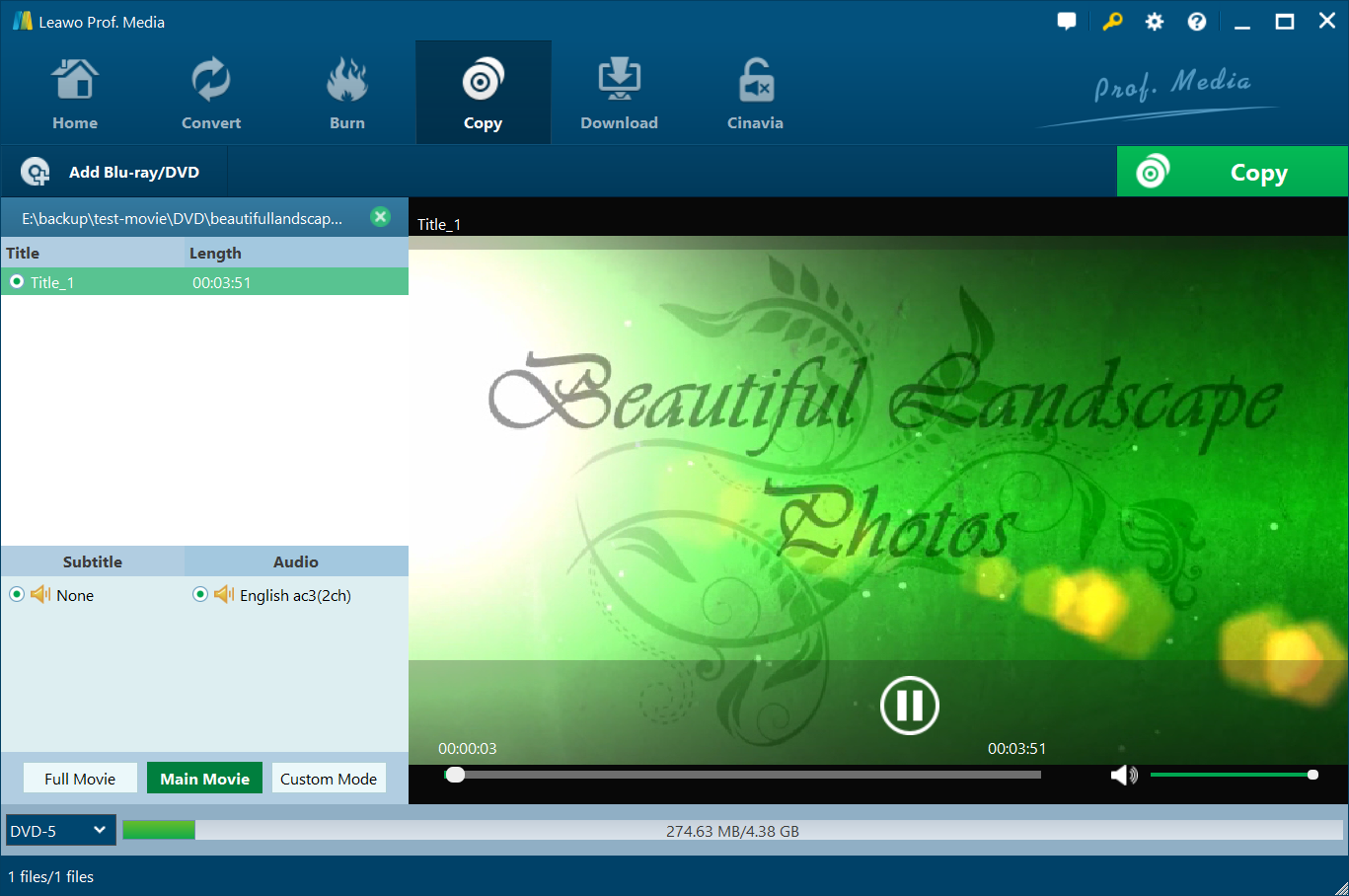 此外,您还可以获取蓝光光盘副本,将其保存在电脑或空白光盘上,而无需更改蓝光电影结构。您可以使用 Leawo 蓝光复制 轻松将蓝光光盘复制到空白光盘、文件夹和/或 ISO 映像文件中,保存到您的电脑上,无需将蓝光电影转换为数字视频文件。作为一款专业的蓝光复制和备份软件工具, Leawo Blu-ray Copy 可以帮助您解密、翻录和复制蓝光/DVD 光盘、文件夹和/或 ISO 映像文件到空白光盘或计算机硬盘中 1:1 您可以选择无损模式、纯电影模式或自定义模式。它甚至还提供高品质 蓝光到 DVD 压缩.