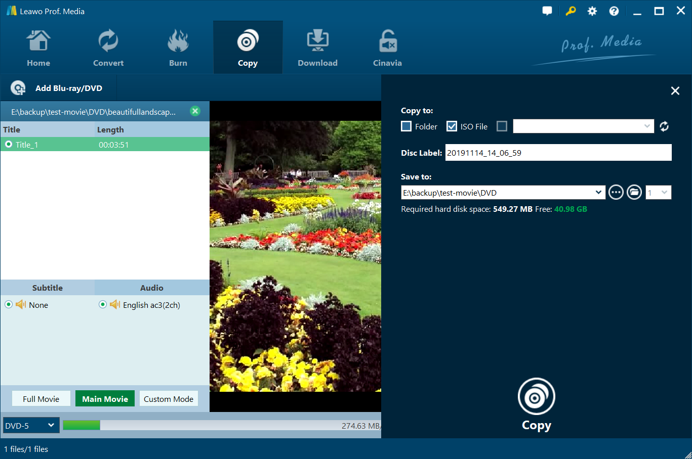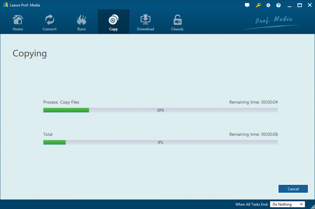 最后,单击底部的“复制”按钮开始将蓝光光盘复制到计算机或空白光盘内 Leawo 蓝光复制。然后您可以查看整个复制过程,直到它结束。