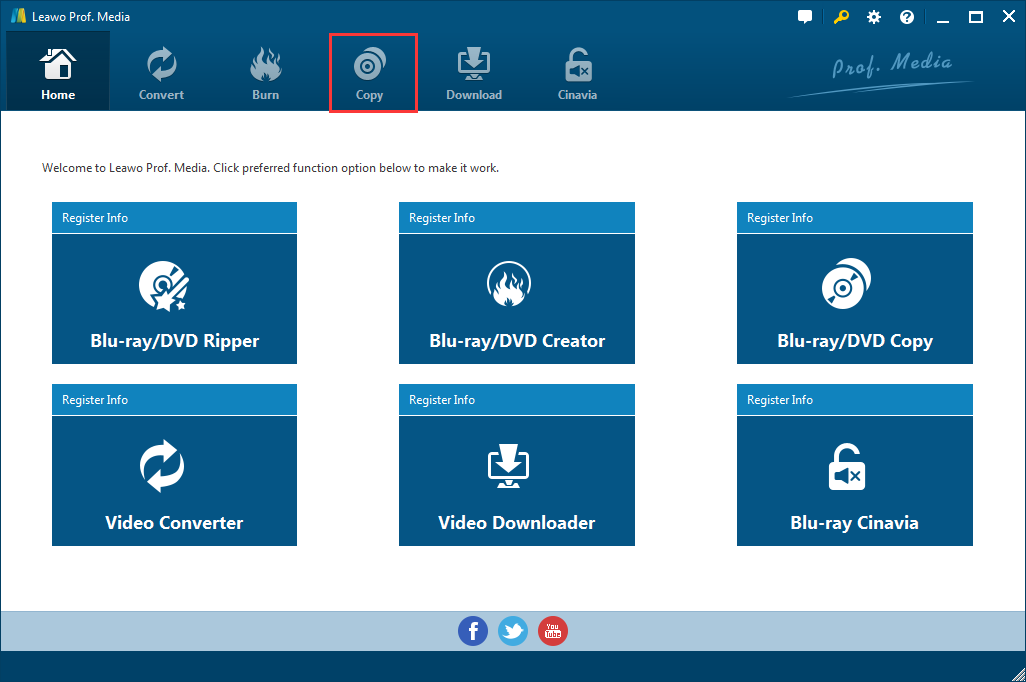开始 Leawo Prof. Media 然后点击菜单栏上的“复制”模块。然后您将被引导至蓝光复制模块。
