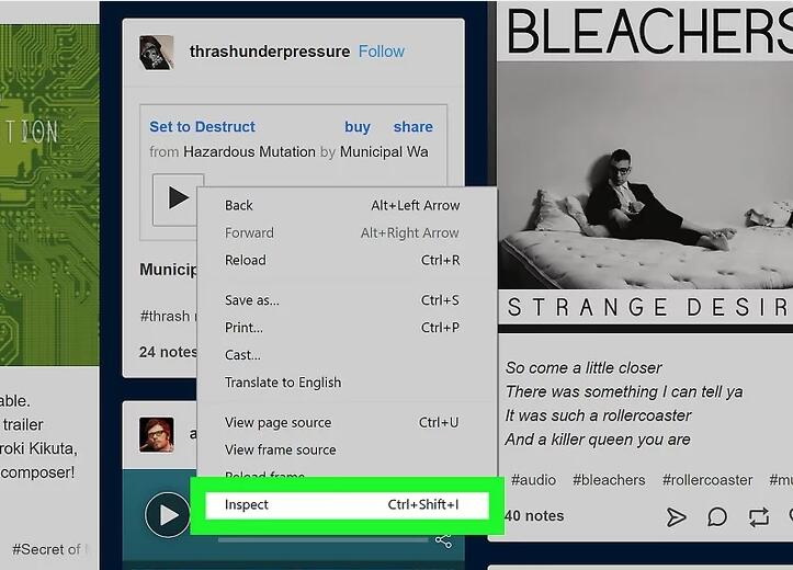 步骤3: 找到歌曲后,在播放歌曲时,右键单击音频并选择“检查”,然后会弹出一个新的工具栏。