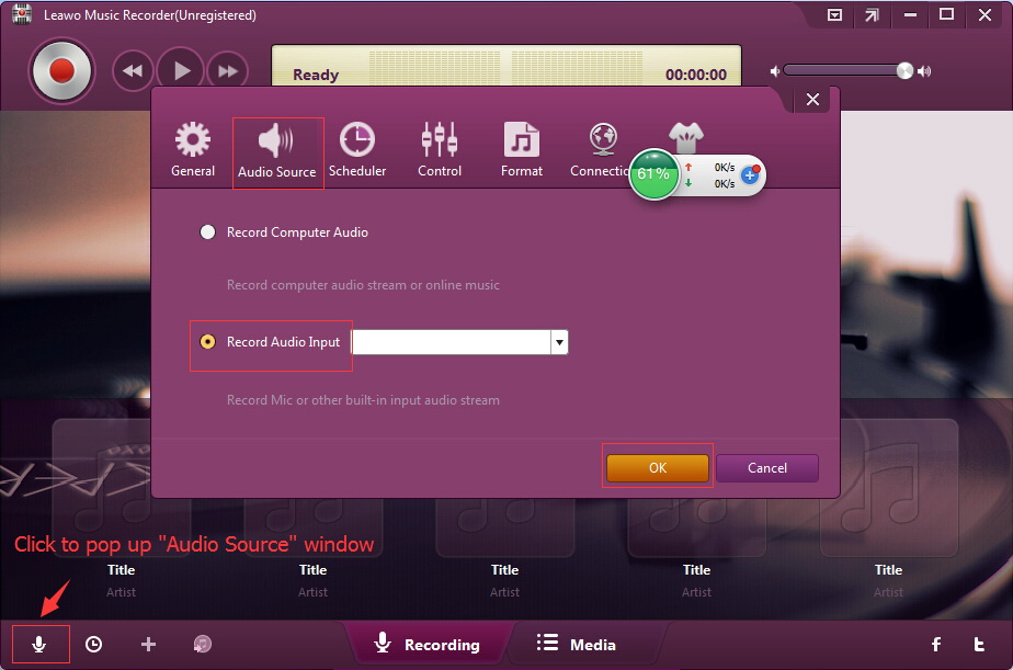 首先点击主界面上的“音频源”图标设置音频源。要录制在线 Tumblr 文件,请选择“录制计算机音频”选项。