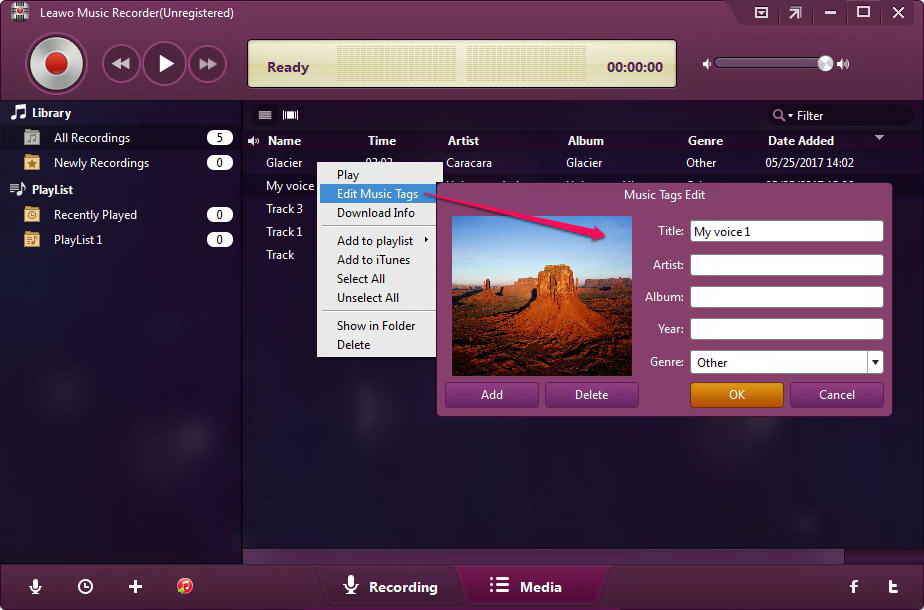 通常,音乐标签可以自动下载 Leawo 音乐录音机。如有需要,您可以右键单击录音,选择“编辑音乐标签”,在媒体面板上编辑歌曲标题、艺术家、年份和流派等音乐标签。