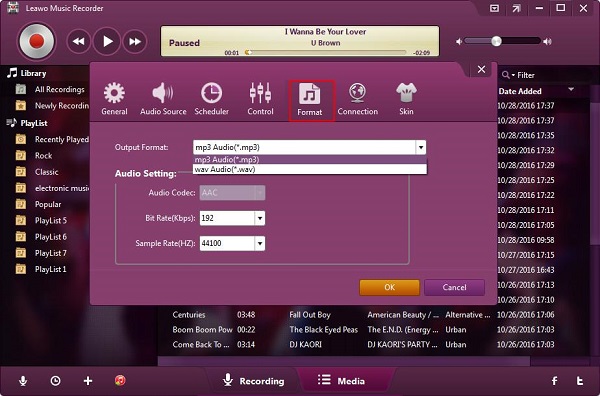 3. 选择表格“格式”,然后您可以选择 MP3 或 WAV 作为录音文件的输出格式。此外,您可以根据需要设置录音文件的参数,包括音频编解码器、比特率和采样率。
