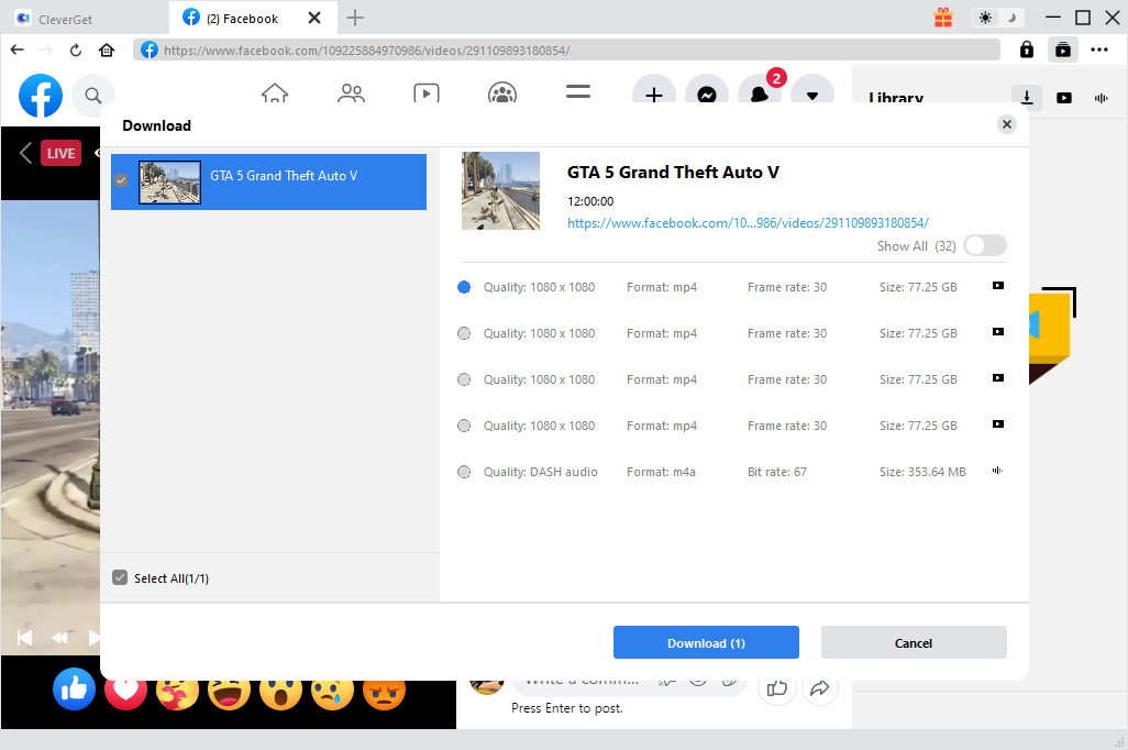 进入目标 Facebook Reel 所在页面后, CleverGet 视频下载器会开始检测本页面可下载视频的所有信息。几秒或几十秒后, CleverGet Video Downloader 会用一个小窗口来显示视频的所有信息,您可以在这个窗口中选择 Facebook Reel 的视频格式、字幕、音频等信息,然后点击“下载”按钮即可下载 Facebook Reel 视频。