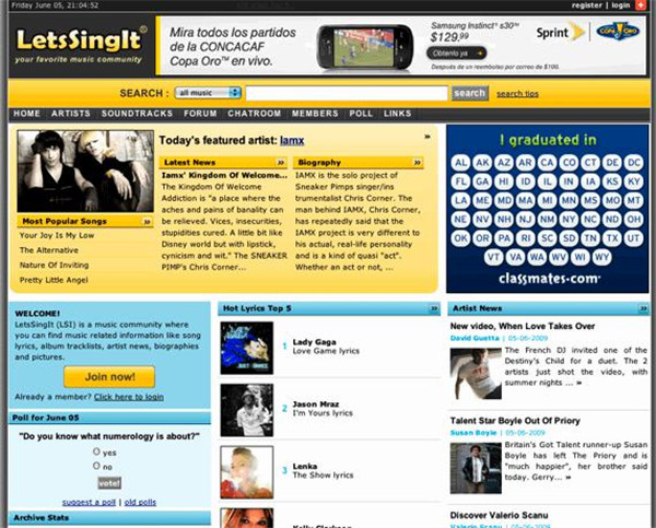 LetSingIt 是一个提供音乐和歌词的网站。主页上强大的搜索框让用户可以轻松找到目标歌曲、艺术家或歌词。此外,该网站还提供艺术家介绍、热门歌曲、唱片目录和粉丝页面。该网站的一大特色是,歌曲的 YouTube 视频也镶嵌在这个页面上。这些 YouTube 视频是由网站用户镶嵌的。如果其中一个链接无效,其他用户可以更正这些链接。当您在阅读歌词的同时阅读这个视频功能时,您会发现更多乐趣。您可以在侧边栏中看到大量信息,让您轻松迷失在大量信息中。