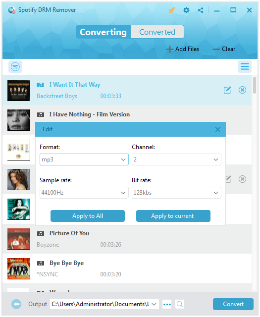 导入完成后,所有您想要的 Spotify 音乐文件都会显示在面板上。现在,将鼠标悬停在某个音乐文件上,即可看到编辑图标,点击该图标即可弹出编辑面板。您可以在其中自由设置输出格式为“MP3”,并根据需要更改音频质量。最后,如果您要将此设置应用于所有导入的文件,请选择“全部应用”;反之,则点击“应用于当前文件”。