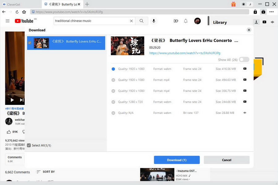 其实,中国传统音乐不仅是听觉艺术,更是视觉艺术。例如,通过视频,你不仅可以观察到演奏者的面部表情,还可以体验到异域风情的乐器。要下载无质量损失的视频, CleverGet Video Downloader 是值得推荐的最佳工具。因为它以高达 8K 的分辨率和 320 Kbps 的音频质量保存视频,从而极大地保留了原始视频中的信息。此外,超过 1000 个网站的支持也使其更具适应性。要下载繁体中文音乐视频,请查看以下指南。