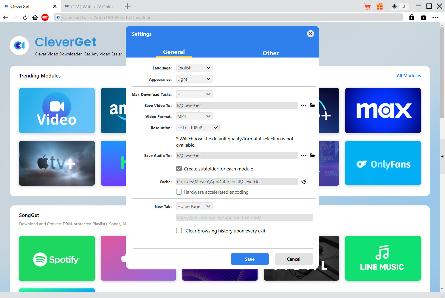 然后,启动软件,并通过软件内置浏览器访问CTV网站。进入“设置”页面,调整保存位置和其他一些参数。