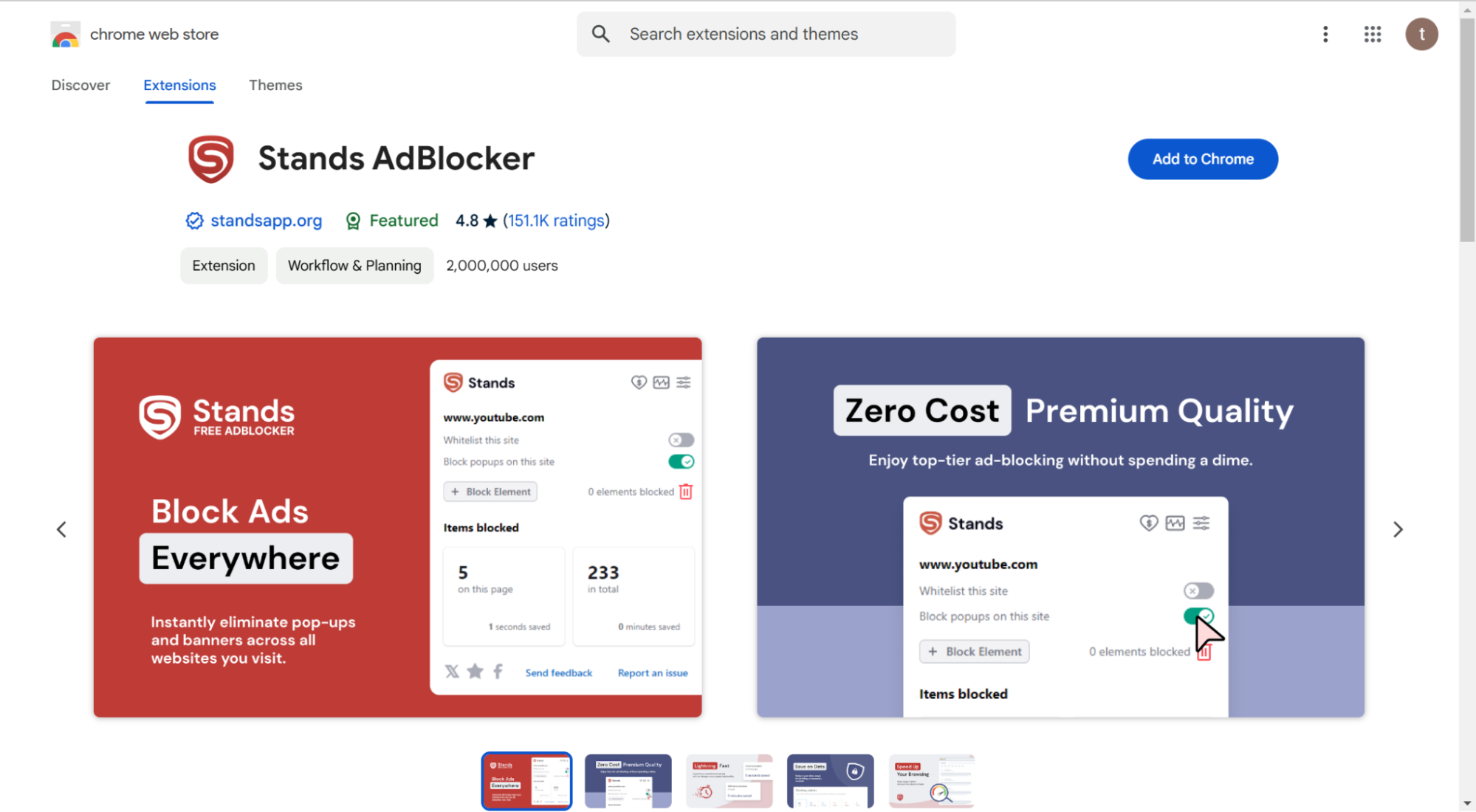 到目前为止,这是最受欢迎的广告拦截器之一。它可以拦截大多数网站(包括 CTV)上的视频广告、弹出窗口和横幅广告。它易于安装和使用,但有时无法成功拦截广告,而且某些广告拦截脚本可能会影响网站功能,例如暂停、加速等。