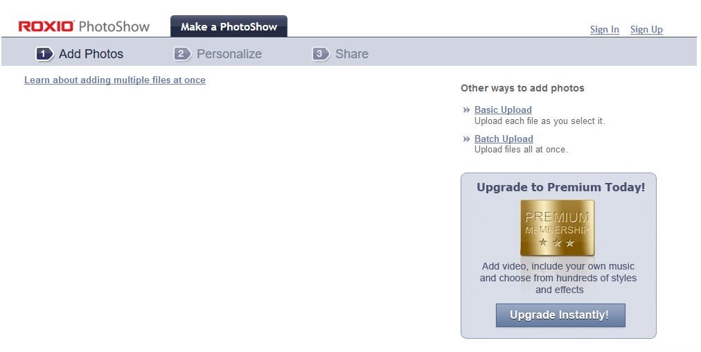 进入Roxio PhotoShow官方网站,点击“添加照片”按钮添加您想要制作成幻灯片的图片。