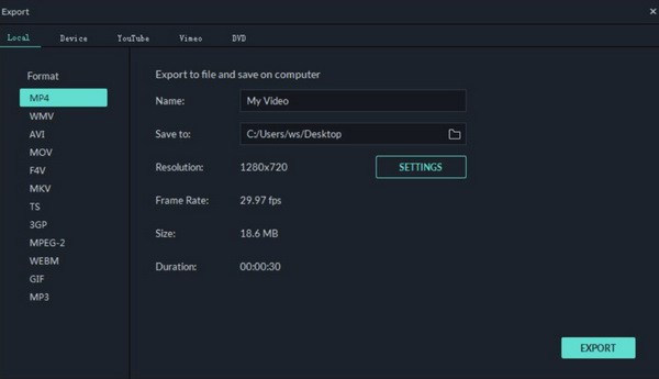步骤4: 导出合并后的 AVI 文件。完成所有 AVI 文件修改后,您可以预览合并后的 AVI 文件,然后再保存。最后,只需点击“导出”按钮,并在您的计算机上确认最终保存路径。稍等片刻,AVI 文件即可完全合并成一个完整的视频。