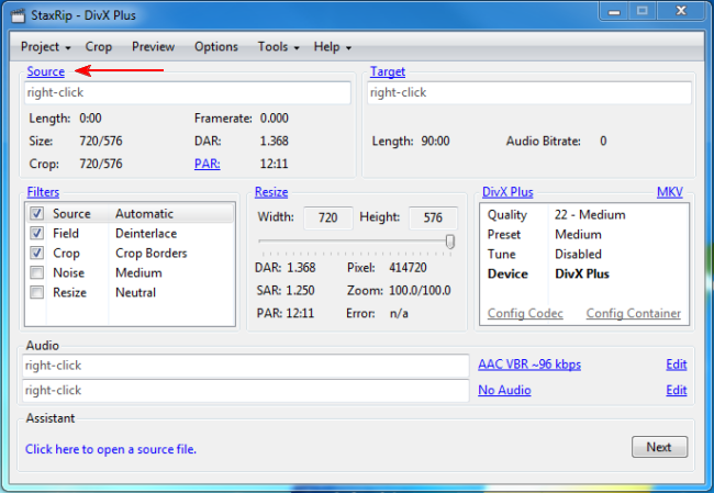 - 启动 StaxRip,然后单击“源”按钮,从光盘刻录机或计算机硬盘加载 DVD 文件。