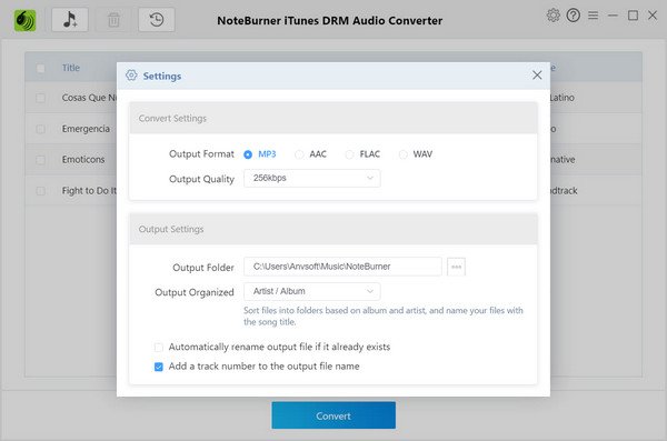您还可以使用 NoteBurner iTunes DRM Audio Converter 将 iTunes M4P 音乐转换为可在 BlackBerry 手机上播放的格式。NoteBurner iTunes DRM Audio Converter 是一款功能强大的音频转换器,可以移除 DRM 保护,并将 Apple Music 曲目、iTunes M4P 音乐和有声读物转换为其他格式,例如: MP3支持 AAC、FLAC 或 WAV 格式。这款专业的 iTunes DRM 音频转换器能够保留输出文件中的歌曲信息,例如封面、元数据(如艺术家姓名、专辑名称、曲目编号和流派)。