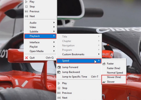 步骤3: 降低视频播放速度。右键单击视频画面,然后点击“播放”选项,再选择“速度”,您会看到“更快”、“正常速度”和“更慢”等选项。要以慢动作播放视频,您需要点击“更慢”选项,然后即可立即以慢动作观看视频。
