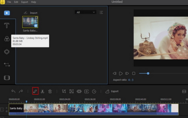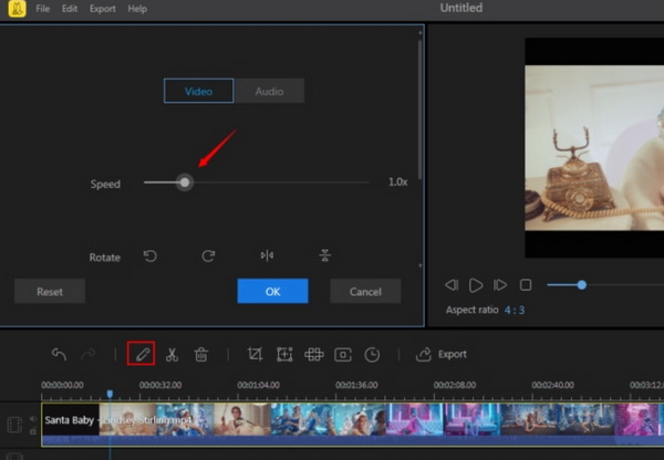 步骤3: 减慢视频播放速度。将视频拖到时间轴栏后,点击下方的“编辑”图标,即可看到用于更改视频播放速度的窗口。