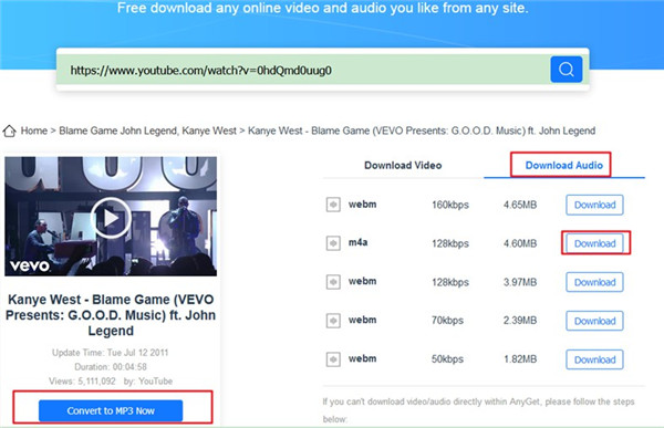 3. 您可以通过此在线音乐下载器下载视频或音频。如果您想获取说唱歌曲音频文件,您可以选择所需的格式并直接点击“下载”按钮。