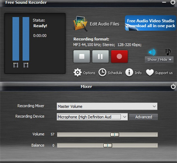 在电脑上启动免费录音机,点击“立体声混音”,然后根据你对声音平衡和音量的需求选择录音设备。