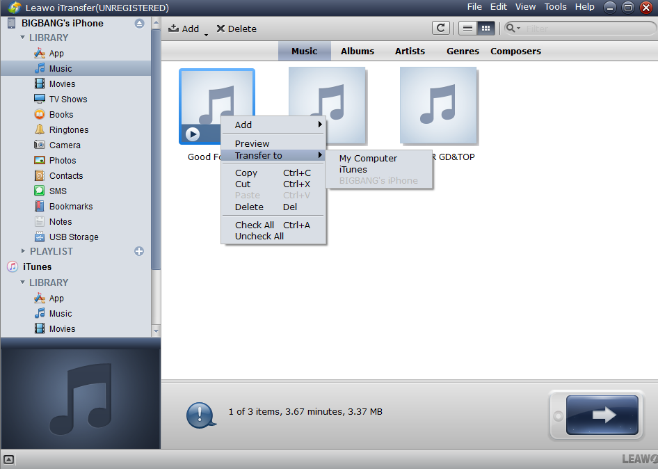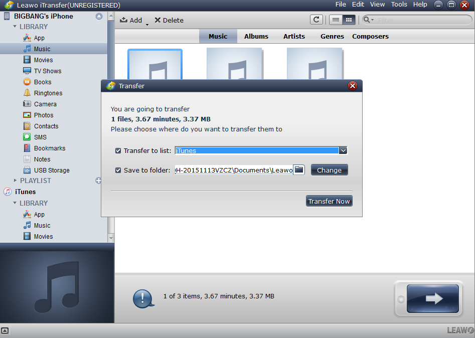 大多数人会选择 iTunes 作为备份 iPhone 的首选。然而,众所周知,iTunes 不允许将未购买的文件从 iPhone 传输到 iTunes。因此,如果您的 iPhone 上有一些未购买的文件,您可以使用 iTunes 的替代方案将未购买的文件从 iPhone 传输到电脑。 Leawo iTransfer 是一款功能强大且易于使用的软件,可用于在 iPhone、iPad、iPod、iTunes 和电脑之间传输音乐、视频、照片和其他文件。它还支持将 iPhone、iPad 和 iPod 数据备份到电脑。以下指南将向您展示如何在更新至 iOS 10 之前使用 iPhone 传输软件备份 iPhone。