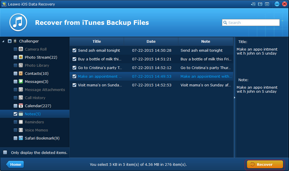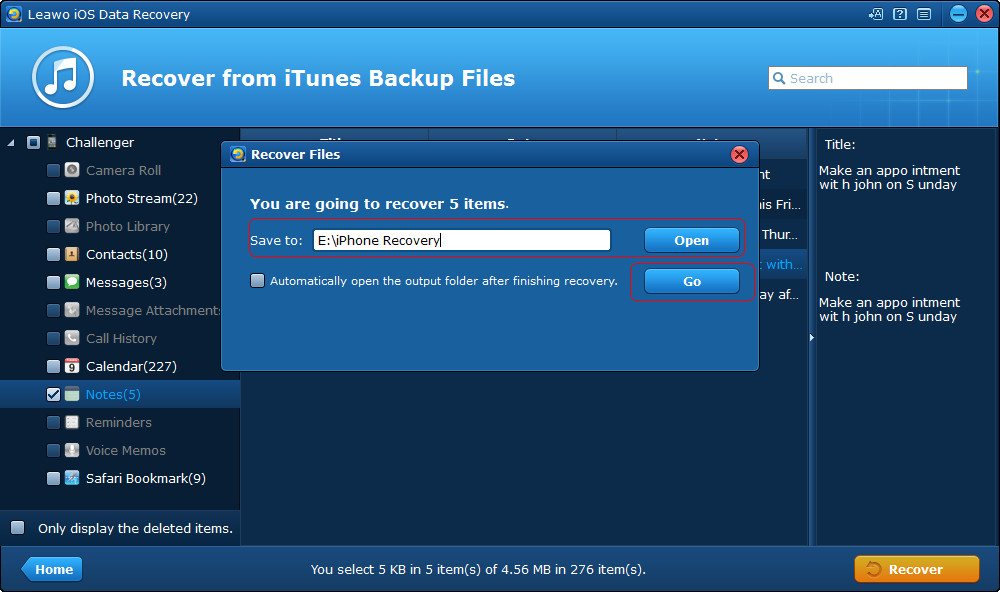- 如上所述, Leawo iOS 数据恢复使用户能够从 iOS 设备恢复已删除的文件。事实上,当程序扫描您的 iPhone 时,它还会在主界面显示可用数据。因此,该程序可帮助用户将笔记从 iPhone 传输到计算机。