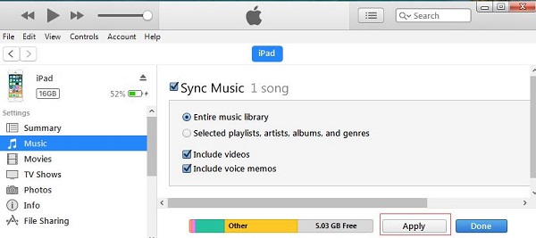 步骤4:选择“音乐”。选中“同步音乐”旁边的框,然后单击“应用”。这就是将音乐从iCloud传输到iPhone的方法。