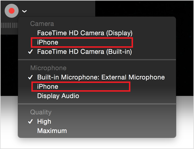 步骤 3。 点击 QuickTime Player 窗口中录制按钮右侧的小箭头图标,然后选择在“相机”和“麦克风”栏中同时显示的 iPhone。之后,QuickTime Player 会将您的 iPhone 设置为录制设备。您的 iPhone 屏幕将显示在 Mac 上的 QuickTime Player 窗口中,您在 iPhone 上执行的所有操作也会显示在 QuickTime Player 窗口中。