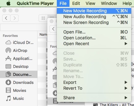 步骤 2。 在 Mac 上启动 QuickTime Player。点击窗口左上角的“文件”>“新建影片录制”,它会将 Mac 的摄像头设置为默认录制设备。