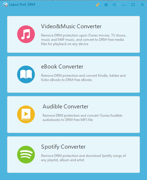 揭开序幕 Leawo Prof. DRM 进入一个界面,您将看到四个选项:视频和音乐转换器、电子书转换器、Audible 转换器和 Spotify 转换器。要转换 iTunes 视频,您需要选择“视频和音乐转换器”以进入 DRM 移除界面。
